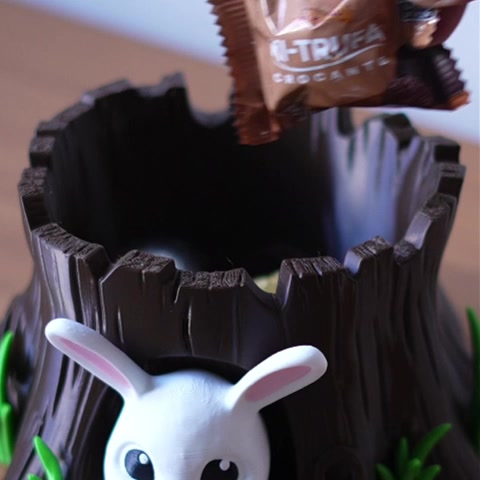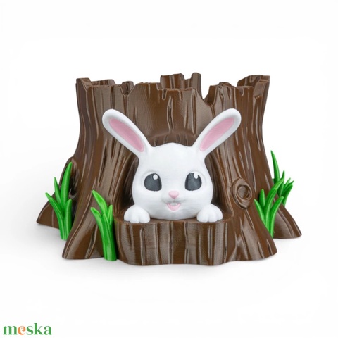 Egyedi karakter: A részletgazdag kidolgozású nyuszi figura és a fatönk textúrája kézműves hangulatot áraszt.