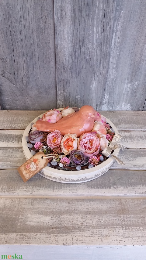 - Anyaga: szalag, művirágok, műzöldek, kártya, fatálca, kerámiamadár, selyemvirágfejek