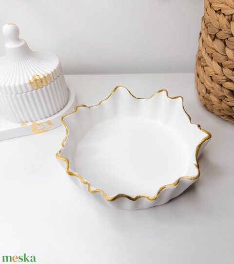 Letisztult, hullámos peremű dekor tál arany kézi festéssel – tökéletes ékszerek, gyűrűk, apró kincsek tárolására.