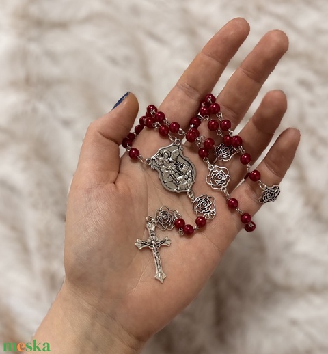 Eladó ez a gyönyörű mélyvörös rózsafüzér, amelyen Szent Mihály arkangyal látható. Szent Mihály a mennyei seregek vezére, a rendőrök, katonák és tengerészek védőszentje, de bárkinek erőt ad, aki védelemre vagy lelki támaszra vágyik a mindennapokban, ugyan is a gonosz/rossz ellen véd.