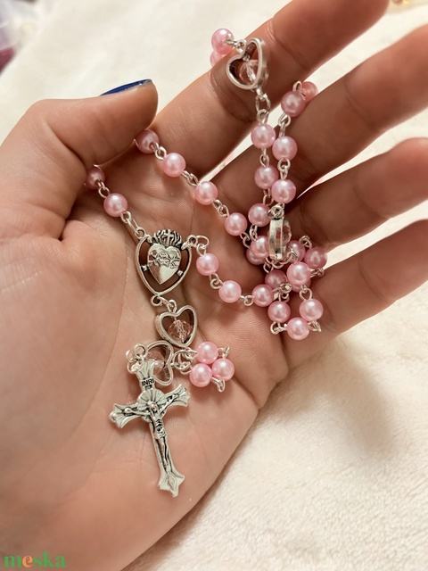 Kézműves rózsaszín rózsafüzér – Jézus Szíve éremmel