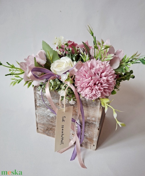 - Anyag/Összetevő művirágok, kártya, fadoboz, szalag