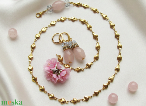 Rózsakvarc köves szett: Szíves arany színű nyaklánc és fülbevaló – Rozsdamentes acél ékszer
