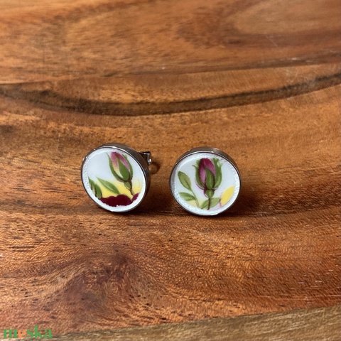 Mentett angol porcelán darabok - rózsabimbós nemesacél fülbevaló, bedugós