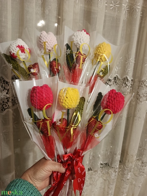 Kézzel készült horgolt tulipánok diszcsomagolàsban