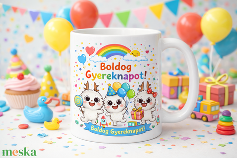 Boldog Gyereknapot feliratú, aranyos figurás kerámia bögre – vidám ajándék gyerekeknek