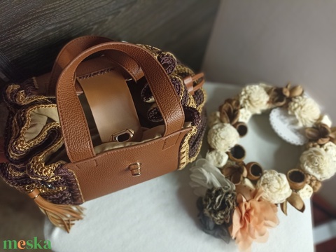 A barna alap és a fonott oldalsó díszítés meleg, természetes hangulatot ad, miközben a táska formája és arany részletei igazán nőies, alkalmi megjelenést biztosítanak.