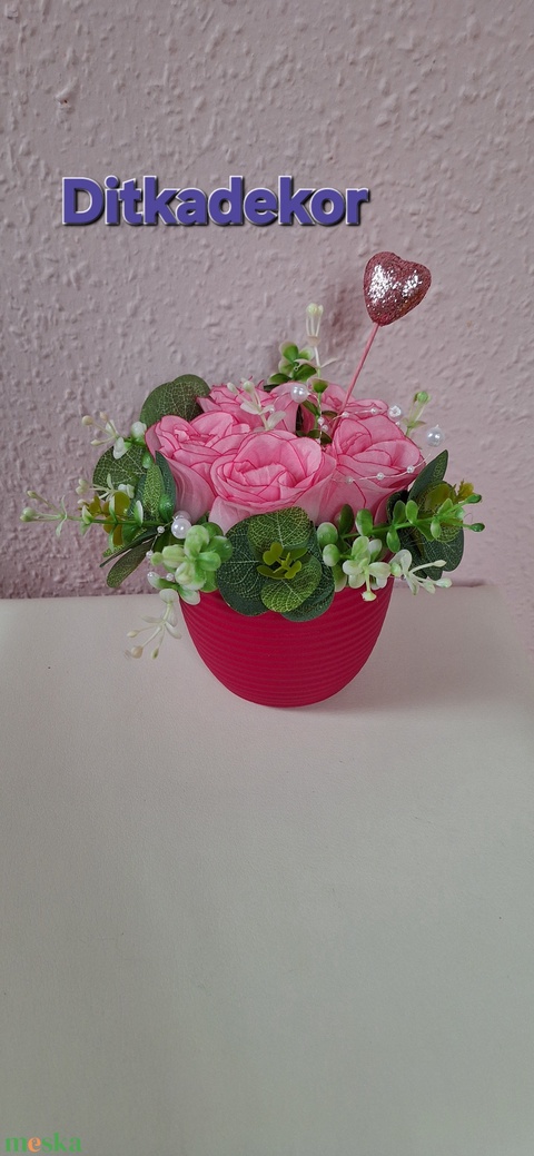 - Anyag/Összetevő élethű tapintású rózsa.kerámia kaspó, tűzőhab.szívdekor, zöld levelek