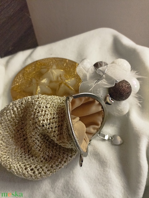 Ünnepi dekorációval fotózva még inkább kiemeli azt a meleg, ragyogó hangulatot, amit ez a kis pénztárca sugároz.