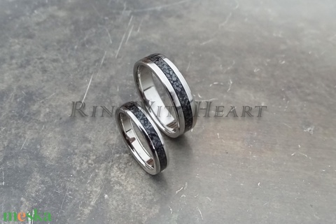 Titán vagy nemesacél gyűrűpár hematittal, hematit gyűrű, jegygyűrű, eljegyzési gyűrű, karikagyűrű, évforduló