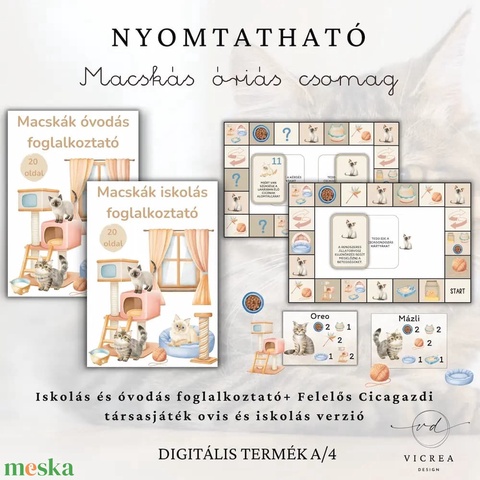 Macskás fejlesztő csomag – ovis és iskolás társasjáték + óvodás és iskolás foglalkoztatók (4–10 év)