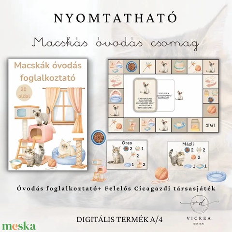 Macskás ovis fejlesztő csomag – társasjáték + foglalkoztató PDF (4–7 év)