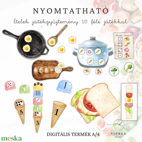 Ételek játékgyűjtemény – Nyomtatható fejlesztő játékgyűjtemény 4–7 éves gyerekeknek