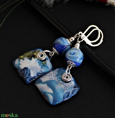 Arlésienne - kék lámpagyöngy fülbevaló porcelán függővel, kék üveggyöngy fülbevaló, MURÁNÓI üvegékszer