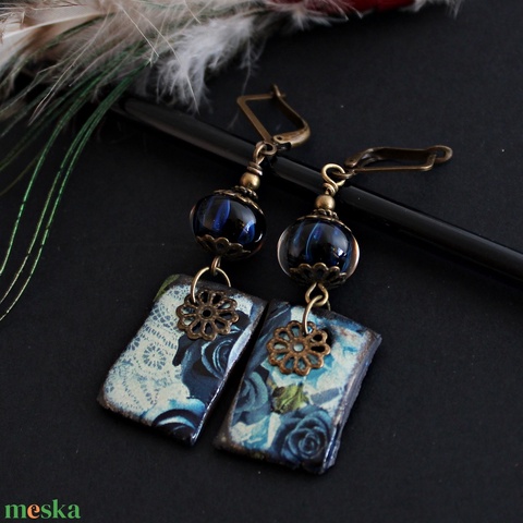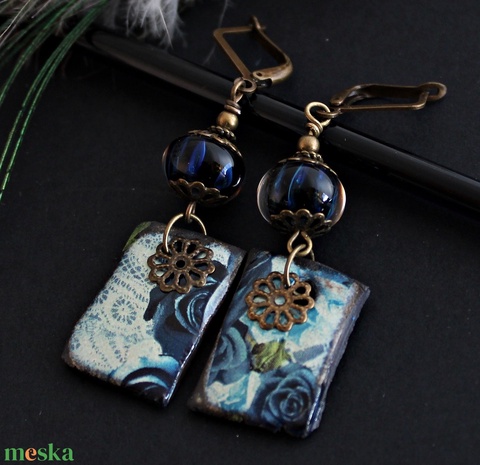 Arlésienne - csíkos lámpagyöngy fülbevaló porcelán függővel, kék üveggyöngy fülbevaló, MURÁNÓI üvegékszer