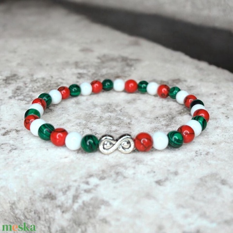 Magyar nemzeti színű ásvány karkötő ezüst színű végtelen jel medállal