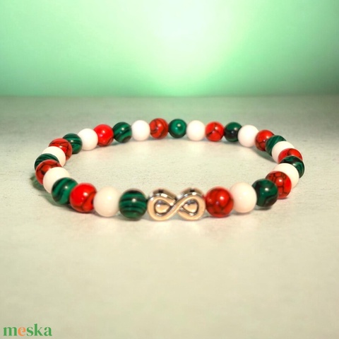 Magyar nemzeti színű ásvány karkötő ezüst színű végtelen jel medállal 16