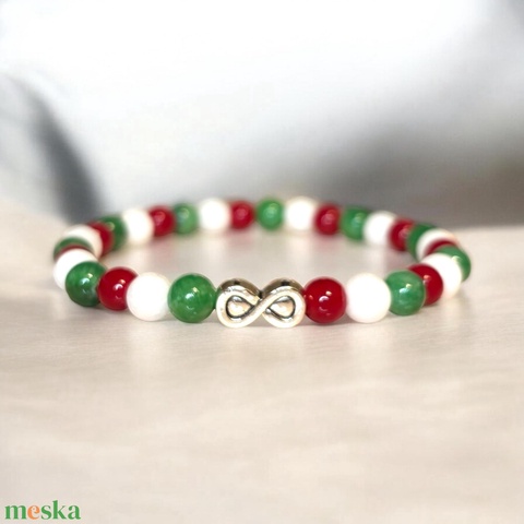 Magyar nemzeti színű ásvány karkötő ezüst színű végtelen jel medállal 17