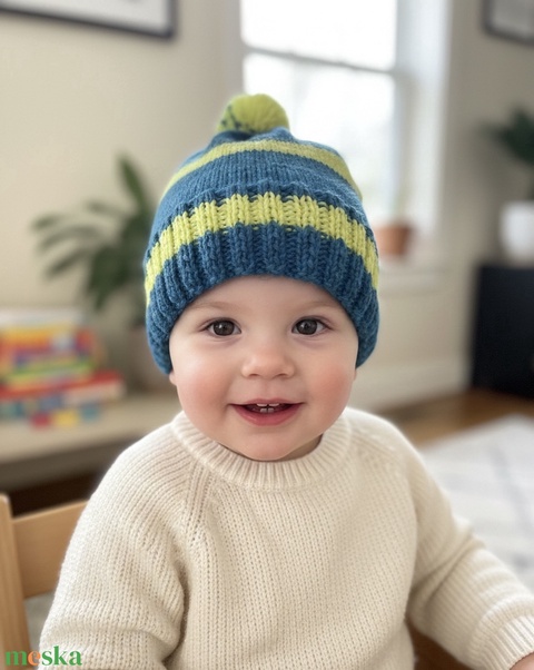 Kézzel kötött vidám gyermek sapka – kék és neon sárga (44-46 cm)