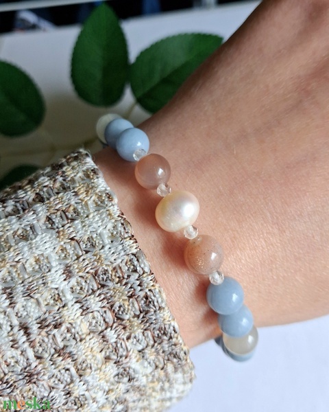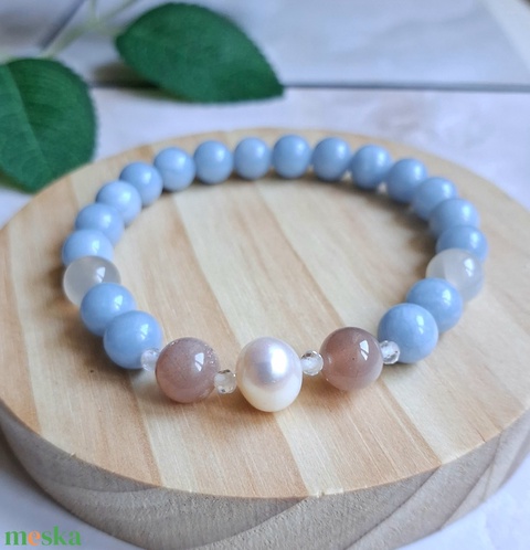 Angelit és holdkő ásvány karkötő tenyésztett gyönggyel