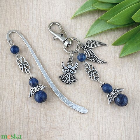 • Könyvjelző, 6 és 8 mm-es lápisz lazuli ásványgyöngyből készült angyalkával – különleges, fényjátékos kiegészítő az olvasás pillanataihoz
