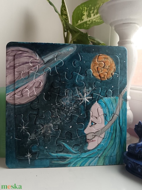 "Irány a Szaturnusz!" egyedi, kézzel festett akrilkép puzzle alapon