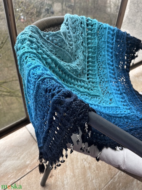 Kézzel horgolt vállkendő türkiz–kék színátmenettel, gyöngyökkel és bojttal
