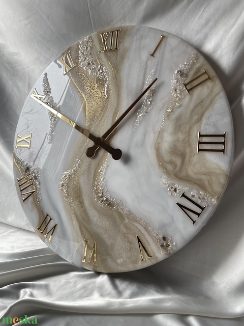 40cm -es egyedi epoxy falióra – elegáns arany-fehér design, kézzel készült lakásdekor