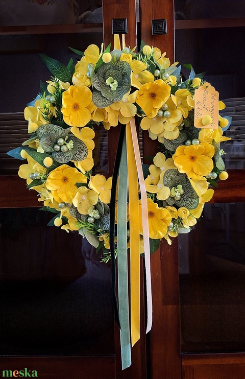 - Anyag/Összetevő szőlővessző alap, sárga mákvirág, hortenzia, gyöngyök, pompomok, sárga szalag, zöld szalag, menta szalag, krémszínű szalag, eukaliptusz