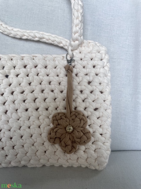 A virág alakú táska charm-ok a természet hangulatát idézi. Kézzel horgolt, puha fonalból készült, közepén elegáns gyönggyel díszítve. A karabineres rögzítésnek köszönhetően könnyedén felhelyezhető bármilyen táskára vagy hátizsákra. Finom, nőies kiegészítő, amely különlegessé teheti a mindennapi megjelenést.