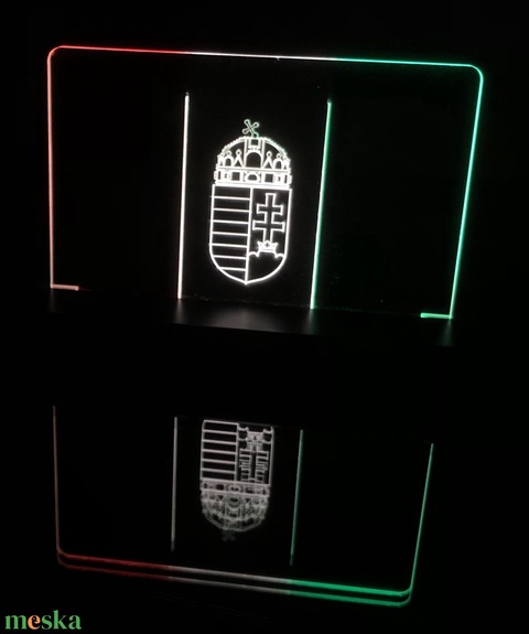 Lézergravírozott, élvilágított, 3 színű dekorációs tábla, fa, asztali foglalattal, 12V-os tápegységgel.