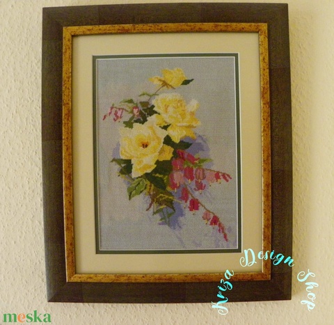 Kézzel hímzett tűgobelin kép - Sárga rózsacsokor virágcsendélet