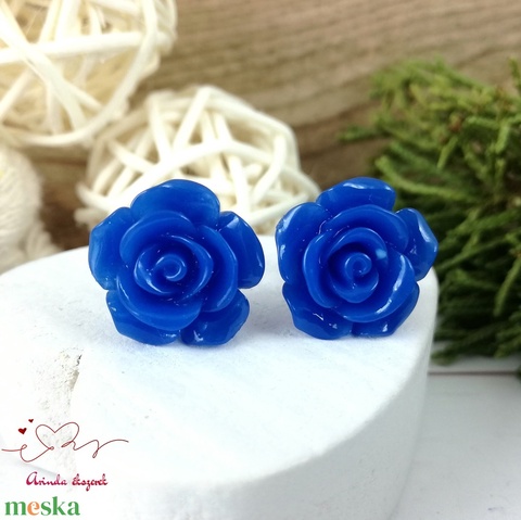 14 mm sötétkék rózsa bedugós fülbevaló – nemesacél alapú romantikus virág ékszer, ajándék nőknek