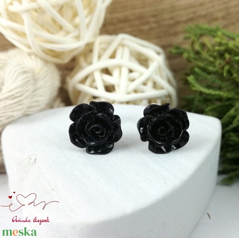 Fekete rózsás bedugós fülbevaló – 10 mm, nemesacél alapú elegáns virág ékszer