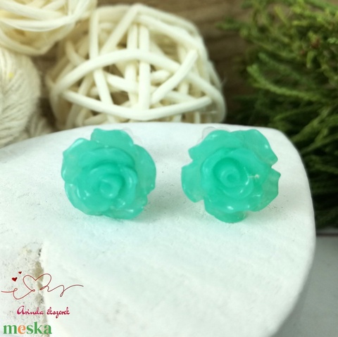 Türkizzöld rózsás bedugós fülbevaló – 10 mm, nemesacél alapú elegáns virág ékszer