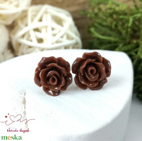 Barna rózsás bedugós fülbevaló – 10 mm, nemesacél alapú elegáns virág ékszer