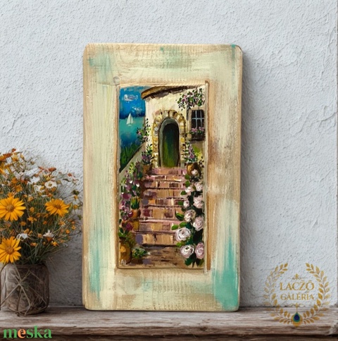Tengerparti nyaraló - Ajándék ötlet, Rusztikus Dekoráció, Fatábla, Tenger, Virágok, Vitorlás, Ház