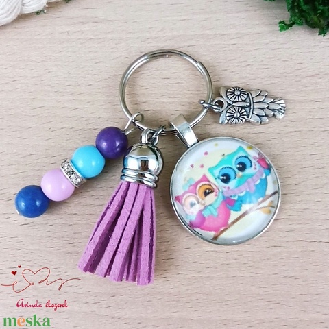 Baglyos üveglencsés kulcstartó lila bojttal – ajándék gyerekeknek és pedagógusoknak