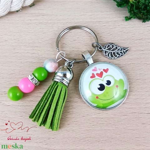 Békás üveglencsés kulcstartó zöld bojttal – cuki ajándék gyerekeknek