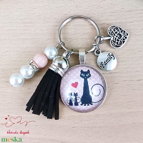 Cicacsaládos üveglencsés kulcstartó fekete bojttal – ajándék macskarajongóknak