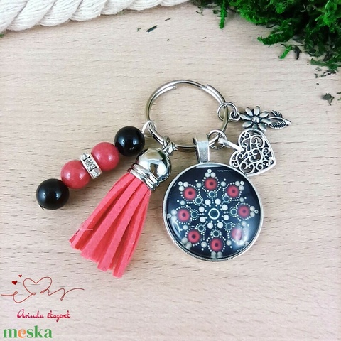 Fekete mandala mintás üveglencsés kulcstartó piros bojttal – elegáns ajándék