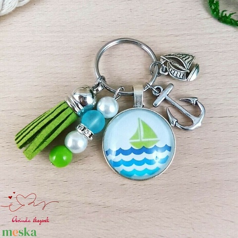 Vitorlás hajó mintás üveglencsés kulcstartó zöld bojttal – tengerész ajándék
