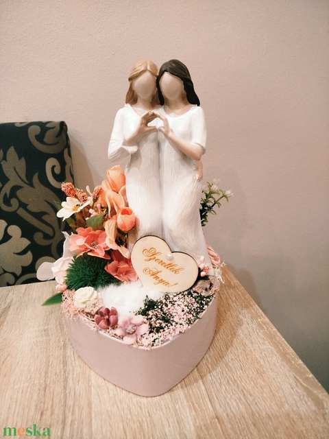 - Anyag/Összetevő szív alakú box, anya lánya figura, művirág szárazvirág, tűzőhab
