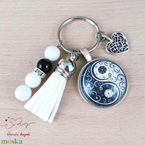 Yin-Yang mintás üveglencsés kulcstartó fehér bojttal – fekete-fehér harmónia ajándék