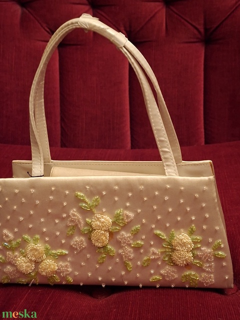 - Anyag/Összetevő selyem, varrócérna, gyöngy, bélés