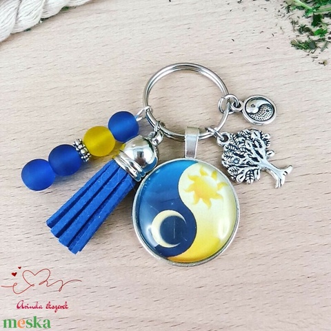 Nap és Hold yin-yang üveglencsés kulcstartó sötétkék bojttal – harmónia ajándék