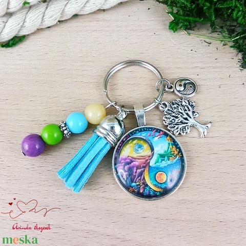 Színes Nap-Hold yin-yang üveglencsés kulcstartó kék bojttal – spirituális ajándék