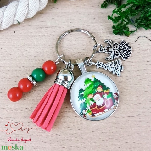 Karácsonyi Mikulás mintás üveglencsés kulcstartó piros bojttal – ünnepi ajándék
