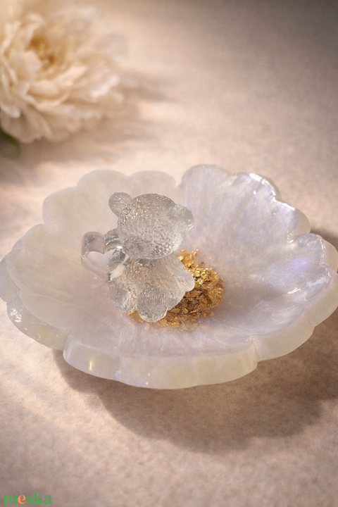 ✨ LILA FÉNYVIRÁG – Gyöngyház ragyogású dekor tál macival