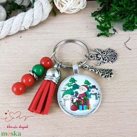 Karácsonyi Mikulás mintás üveglencsés kulcstartó piros bojttal – ünnepi ajándék